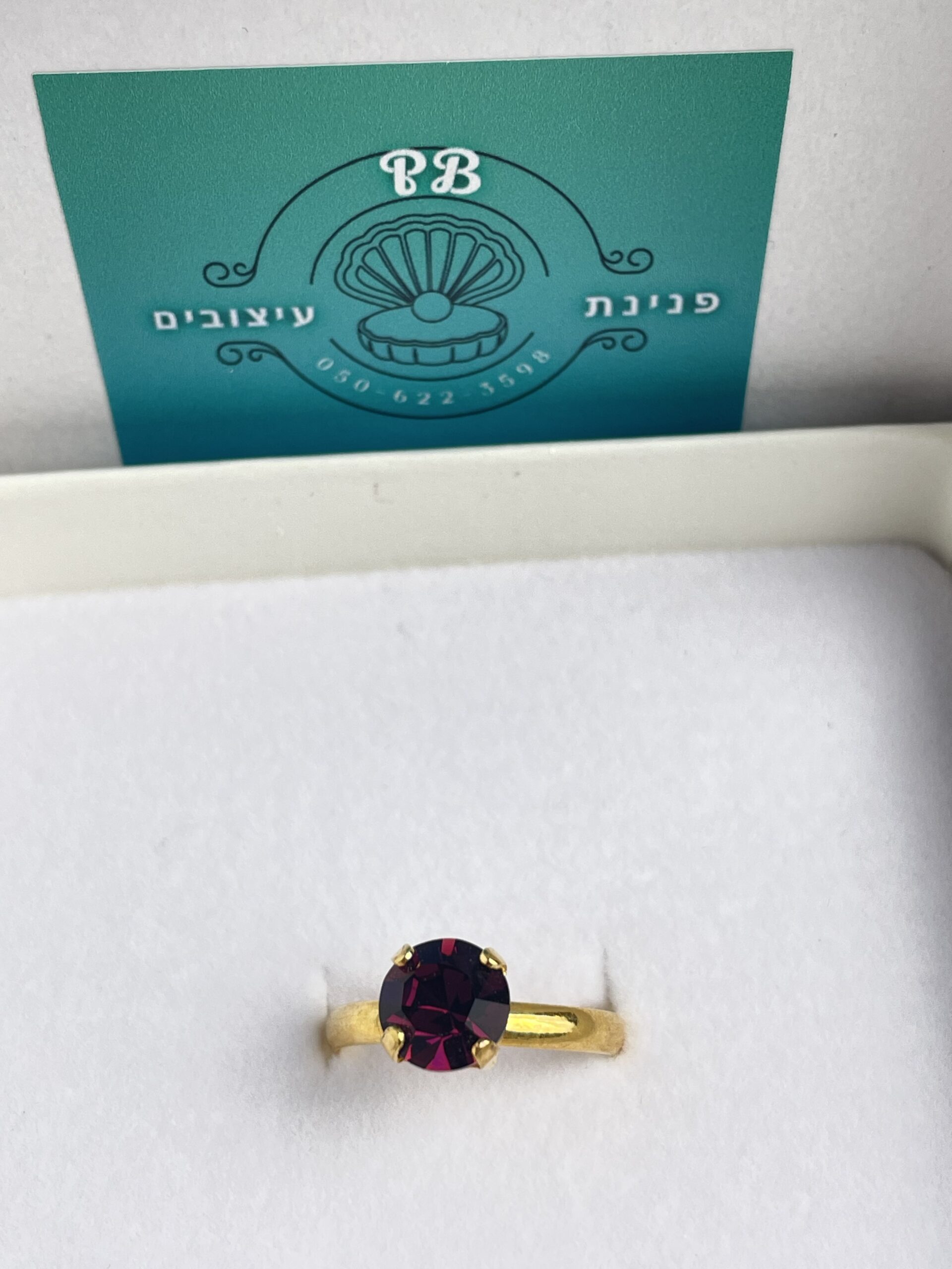 טבעת בעבודת הלחמה , משובצת באבן סברובסקי סגולה , בציפוי זהב 24 קארט.
